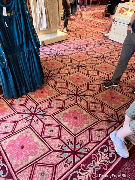 This new carpeting is in various shades of pink in a detailed pattern that fits the vibe of the store.