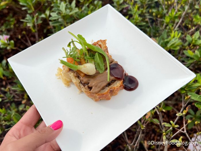 Also from Craftsman's Courtyard, we got the Beef Wellington! This has mushroom duxelles, prosciutto, and puff pastry with red win demi-glace and baby vegetables. We got it for $8.50! pic.twitter.com/hGhHNHtD7l