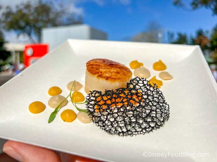 Over at Moderne (a new booth for the year), you’ll find Pan-Seared Scallops with Vanilla-Butternut Squash Purée, Brown Butter Cauliflower Purée, and Lime Foam. While the booth is new, this item isn’t! In 2022, it was over at The Artist’s Table. It is priced at $7.50 this year.