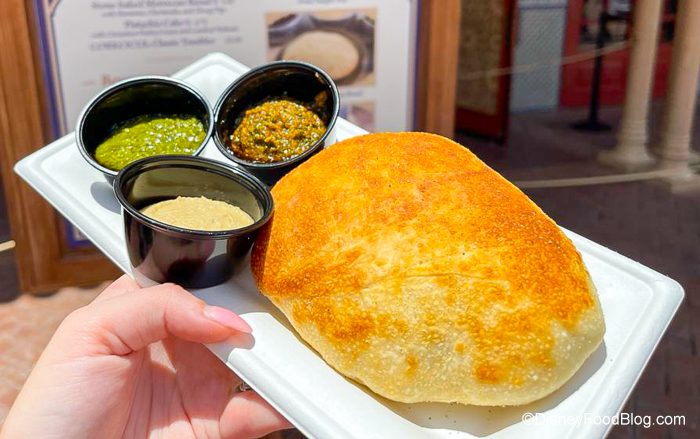 We also tried the Stone-Baked Moroccon Bread during our visit to the Food & Wine Festival. The bread was so light and fluffy — it doesn’t even NEED any dips. The hummus just tasted like regular store-bought hummus, and the Zhoug dip had a strong garlic taste, but we liked it. The chermoula dip had a strong olive taste, so if you don’t like olives, you might not like this dip.