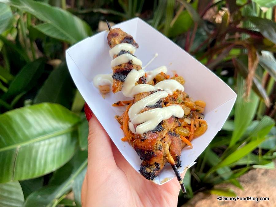At the 2022 EPCOT Food & Wine Festival, the Moroccan-Spiced Lamb Kebab was very well-cooked and also had that nice char on it. The seasoning was delicious, but again the garlic aïoli still tasted heavily of mayonnaise. We also found the chickpea and carrot salad with this one a little bland. It did taste a LITTLE different like there was more vinaigrette on it.