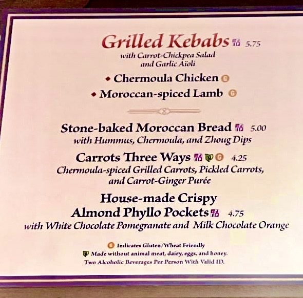 Tangierine Cafe: Flavors of the Medina is located in the Morocco Pavilion, inside the original Tangierine Cafe quick service spot that was there before the 2020 closures. For the past few festivals, we’ve seen Grilled Kebabs and Stone-baked Moroccan Bread as options on the menu, and they’re here yet again.