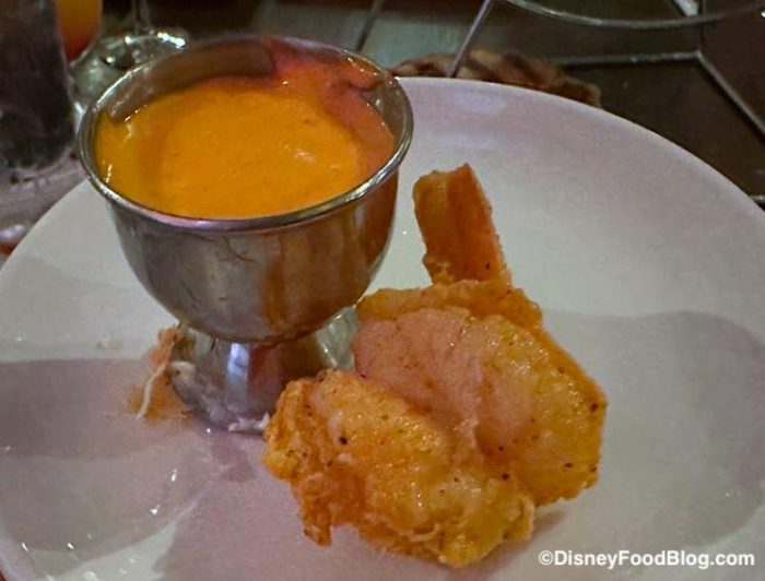 We had the chance to sample the Texas Tostados and the Jumbo Fried Shrimp. The Texas Tostados were similar to nachos but were made on gyoza skins, which had a nice and crispy texture. They were topped with BBQ chicken, sautéed onions, cheddar and Monterey Jack cheeses, sour cream, BBQ sauce, and pico de gallo. We really enjoyed these! They were wonderfully cheesy and the gyoza added a nice crispy texture. They were a bit simple but had great flavor.