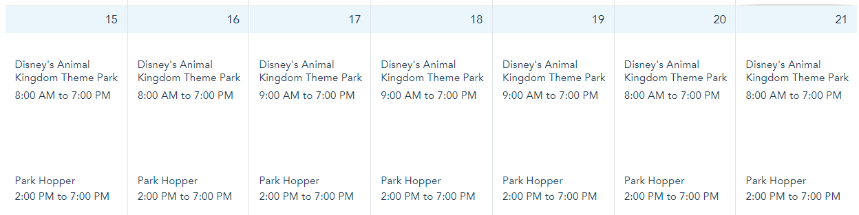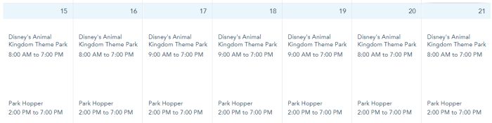 At Disney’s Animal Kingdom, the park hours are from 8AM-7PM on January 15th-16th, and 20th-21st. The hours for January 17th-19th are from 9AM-7PM.