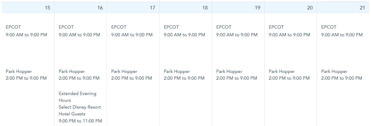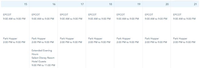 At EPCOT, park hours are from 9AM-11PM from January 15th-21st.