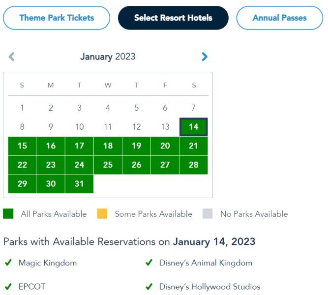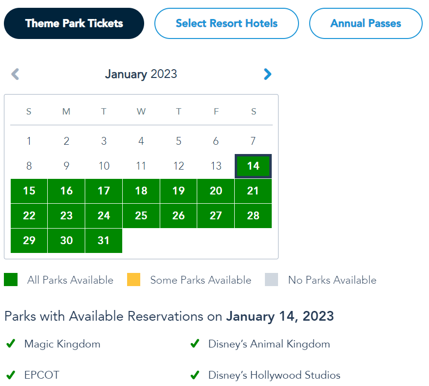 Your park pass reservation availability is dependent on whether you just have theme park tickets, are a Disney World hotel guest, or have an Annual Pass, depending on which category your ticket falls under. For visitors with Theme Park Tickets, all four parks are available from January 15th-21st.