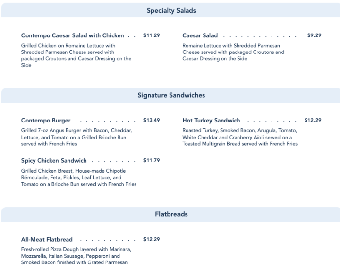 The Contempo Cafe menu is pretty extensive, and Disney often features specialty snacks and items here. Of course, you’ll find the typical allergy-friendly menus and offerings available here as well.