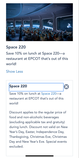 We’ve got a whole page dedicated to Disney discounts and deals we find and make sure to keep it updated as we find more. You should always check out potential discounts before you plan your vacation, and there are even some discounts for certain restaurants you may dine in. If you’re planning to dine at Space 220 on your next trip, don’t miss this simple way to save some money!