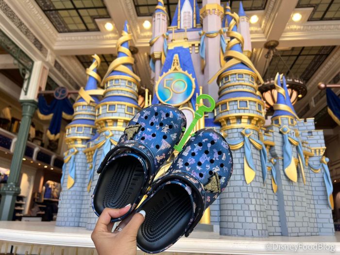 These Crocs have an EARidescent shine and feature the park icons, characters, and the 50th anniversary logo, of course! There is also a 50th anniversary logo charm on each shoe. We spotted these in the Emporium in Magic Kingdom!