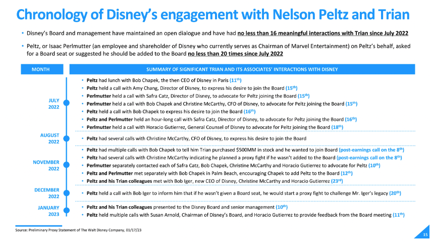 And finally, Disney ends with a chronology of Peltz’s interactions with Disney, dating back to the lunch he had with then-CEO Bob Chapek in July of 2022 in Paris. It goes through Peltz’s various calls with Disney officials and executives as he expressed his desire to join the board.