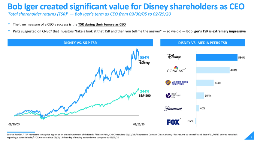 The filing then goes on to talk about how Iger created value for shareholders during his time as CEO, specifically in terms of total shareholder returns (which is defined as stock price appreciation plus reinvestment of dividends).