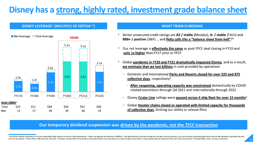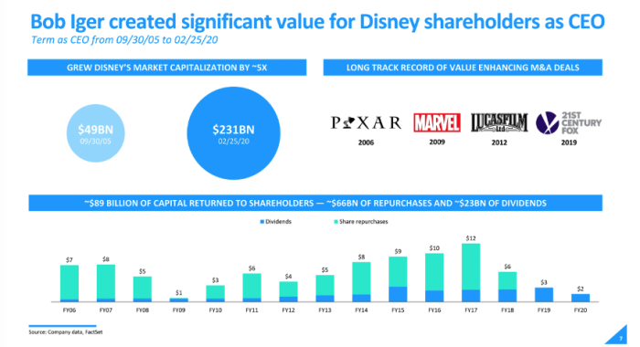 But, again, Disney has opposed Peltz’s proposal to get on the Board. Instead, they insist that Disney has a highly rated investment grade balance sheet, unlike what Peltz has called a “balance sheet from hell.” And they point out some things the Trian group is potentially not focusing on enough — like the impact of the global pandemic. Disney insists that the dividend suspension was due to the COVID-19 pandemic, and not the Fox transaction.