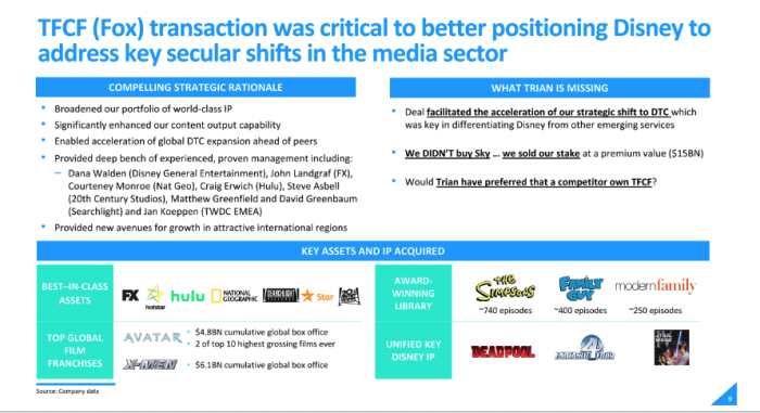 That includes the Fox acquisition. Disney specifically notes that by acquiring Fox, they “broadened [their] portfolio of world-class IP,” enabled their direct-to-consumer side to expand quickly, and enriched the Company with the knowledge and experience of members of the Fox team.