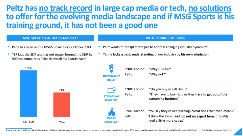 In the SEC filing, Disney goes on to note that Peltz has NO track record in large cap media or tech, and NO solutions that he could offer for the evolving media landscape. They also critique Peltz’s history with MSG sports and say that if that is his training ground, “it has not been a good one.”