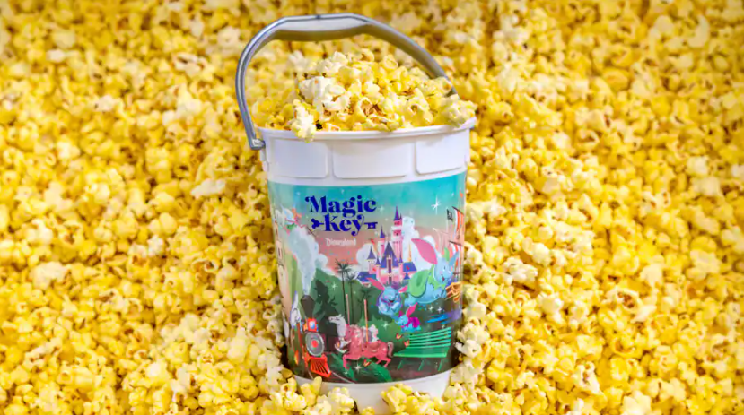 This isn’t the only new popcorn bucket design! For Disneyland Annual Passholders, there is also the Disney100 Magic Key Refillable Popcorn Bucket. Only for Magic Key holders, this beautifully illustrated bucket includes a variety of iconic attractions from Disneyland.