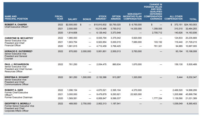 But there’s more. According to the report, Morrell’s total compensation was $8,365,403 for the short months he spent with Disney — that included a $489,500 salary, his $2,750,000 bonus, over $2,000,000 in stock awards, and over $1,000,000 in other compensation. Divided by around 67 business days that would mean he earned around $123,020 per DAY.