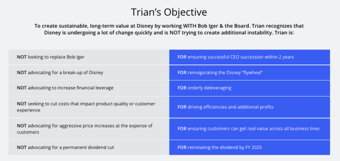 There’s a chart listing more of Peltz’s objectives on the company’s site about Disney:
