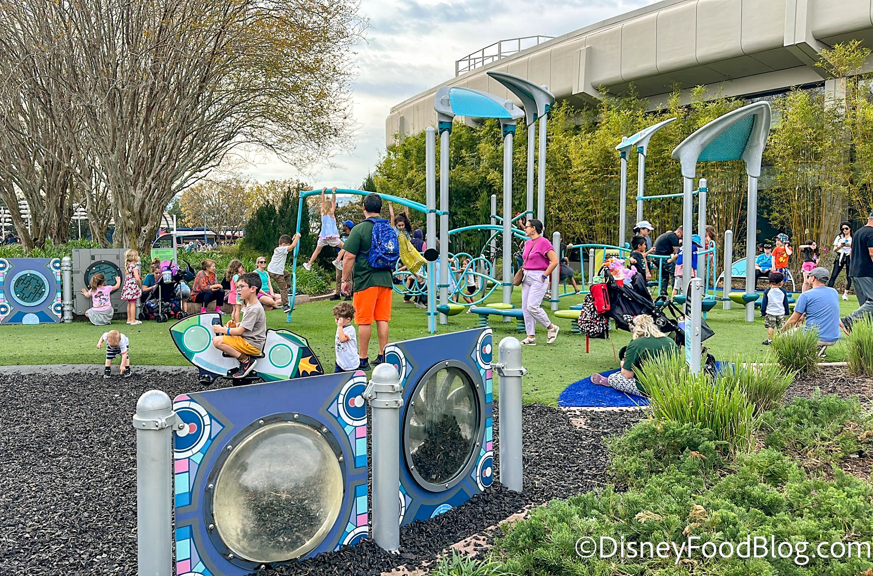 There’s one small place where you can find Wall-E and Eve currently, tucked away in World Discovery. The Green Landing Play Zone is a playground area for little ones located next to Creations Shop, and it has seen a few different themes over the years. Right now, it’s themed to Wall-E, and you can spot the two characters featured on the entrance sign.