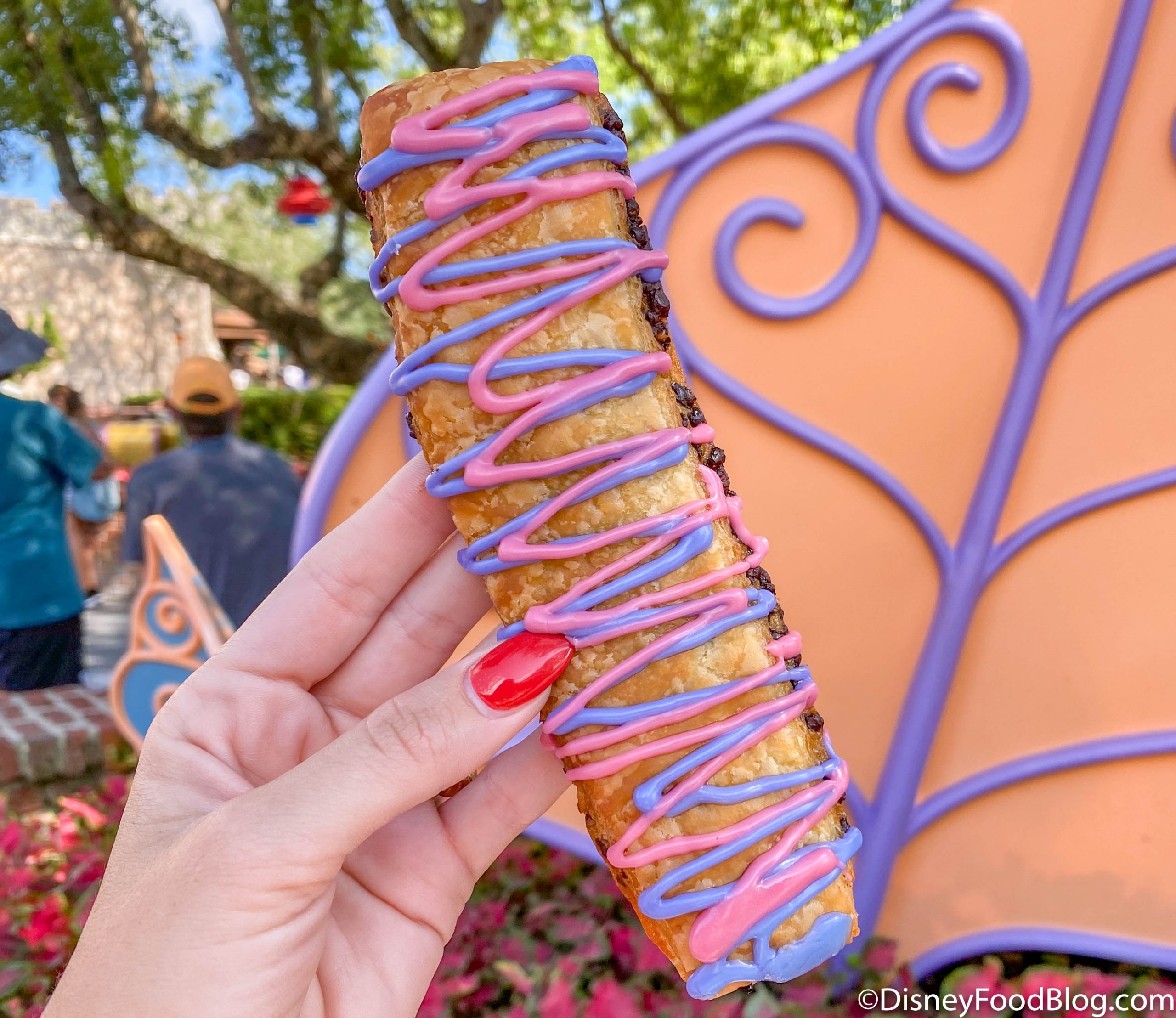 While we’re going down a rabbit hole of the best exclusive Magic Kingdom snacks, it’s only fitting that we talk about the Cheshire Cat Tail at Cheshire Cafe in Fantasyland. The Cheshire Cat Tail is basically a Chocolate Danish Twist dressed up with drizzles of pink and purple icing to resemble the mysterious and charming Cheshire Cat from Alice in Wonderland.