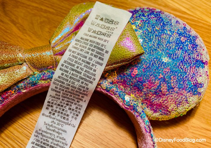 Instead, these ears have a short tearaway tag! FINALLY, no long tags to cut off from our ears! We spoke with a Cast Member and they said each tag layer was tearable, but the first one is silky and meant to stay on the ears comfortably.