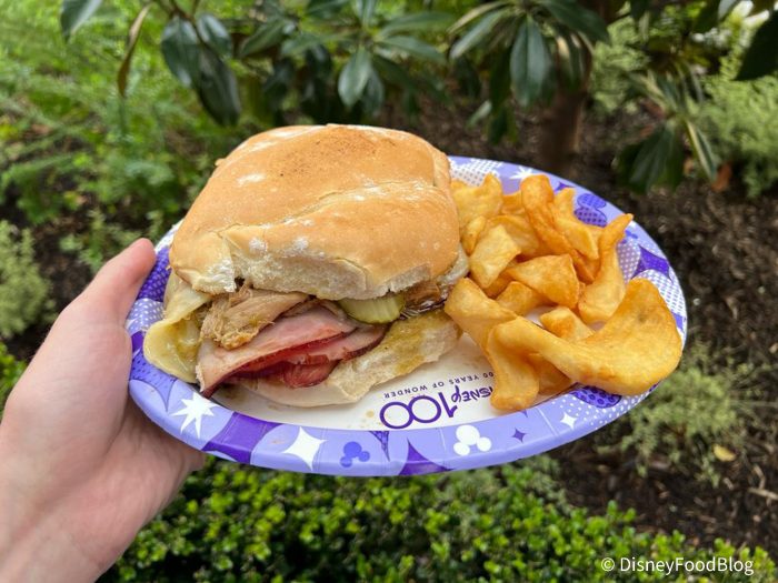 For a savory option, we tried the Cubano Dog for $15.49. On the toasted Telera bread, you’ll get a hot dog, Mojo pork, Cubano-style ham, Pepperjack cheese, pickles, and Mojo mustard with a side of a side of Mandarin oranges or their Filmstrip Fries.