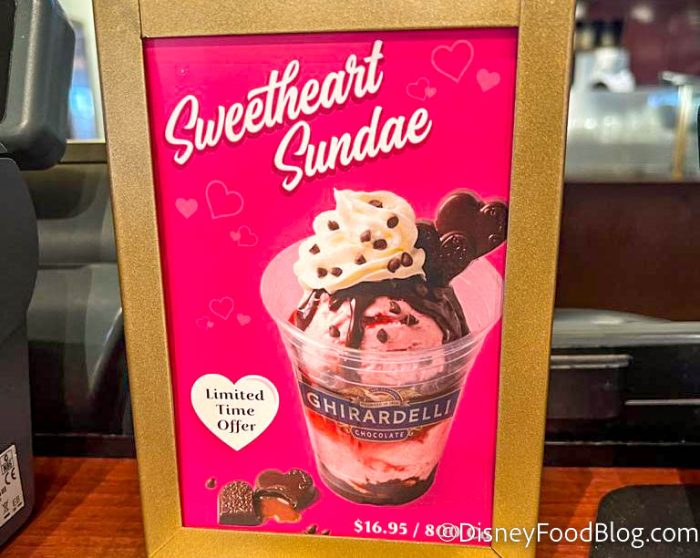 We stopped by Ghirardelli Soda Fountain & Chocolate Shop recently, and we were greeted by this little placard announcing a new Valentine’s Day-themed ice cream treat!