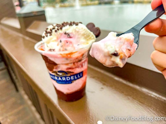 There’s a LOT of chocolate in here, so if you’re averse to those flavors, you might want to avoid this treat. Also, if you’re on a budget, there are less expensive snacks out there and around Disney Springs. But all in all, it was a delicious combination of flavors if you’re craving that chocolate-covered strawberry vibe.