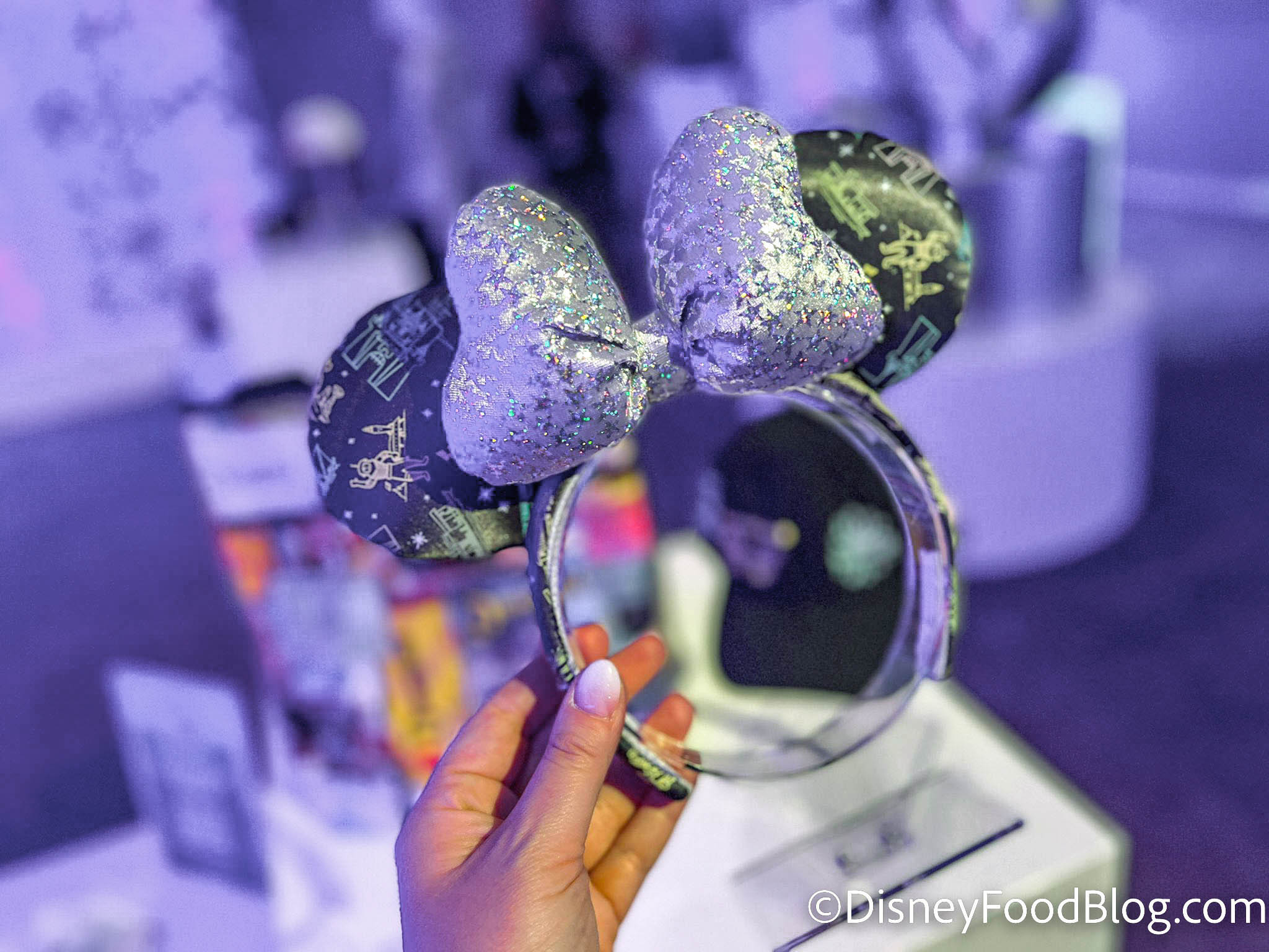 Let’s start out with these Disney100 Minnie ears, covered in a pattern of iconic attractions, and topped with a starry silver bow. We think they’re going to be popular!