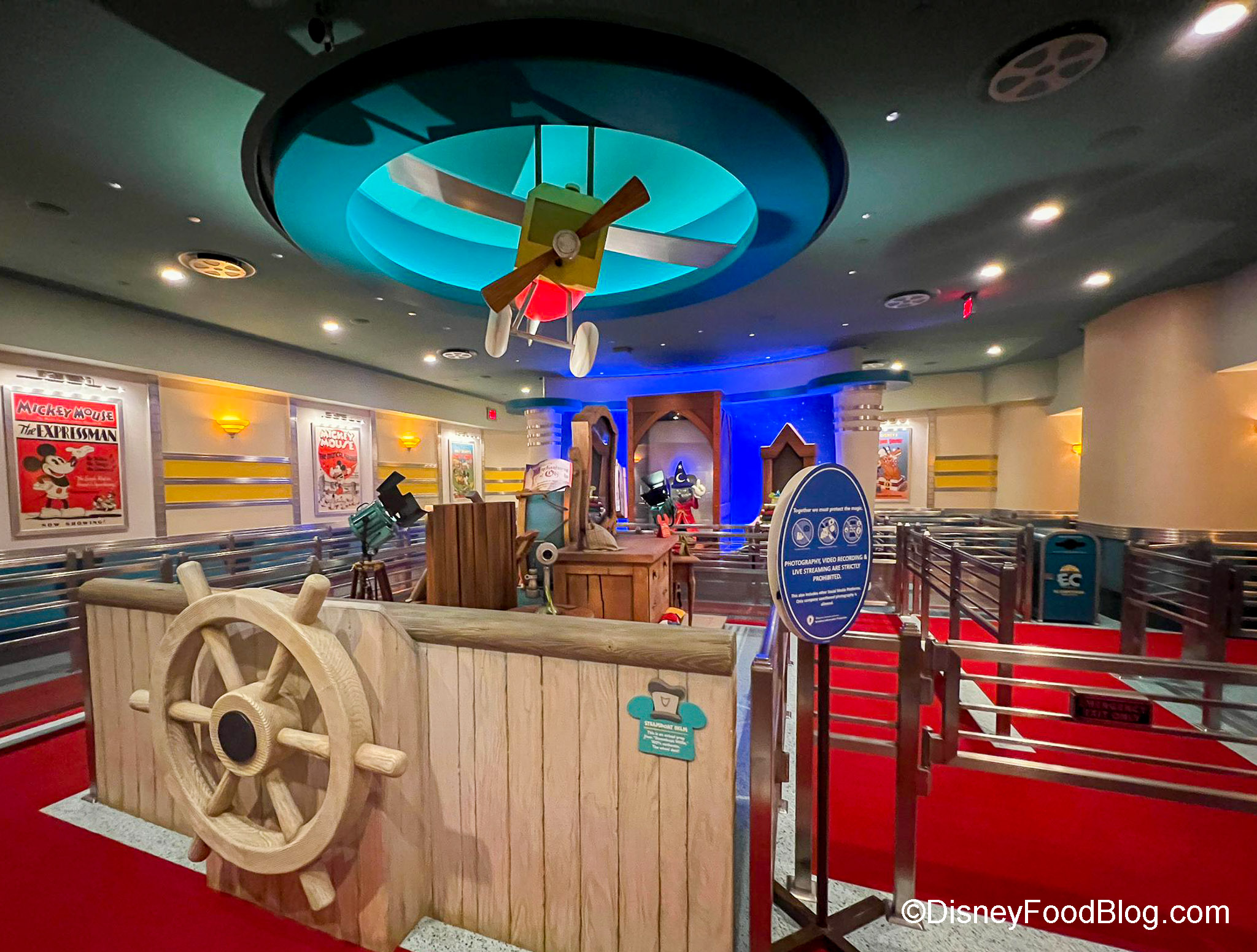 The queue also has “props” from classic Mickey cartoons, like Steamboat Willie.