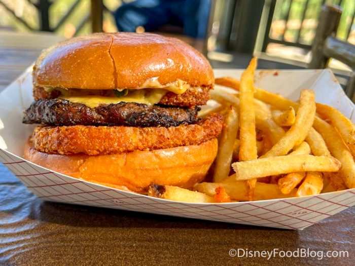 In Critter Country there’s a spot where all the creatures prefer to dine, and that’s Hungry Bear Restaurant! This restaurant is home to standard American fares like chicken sandwiches and burgers. The new 100th Anniversary items definitely fit the theme; on the menu, you can now find a Potato & Cheddar Cheeseburger and Lemon Chiffon Pie. Let’s start with the burger.