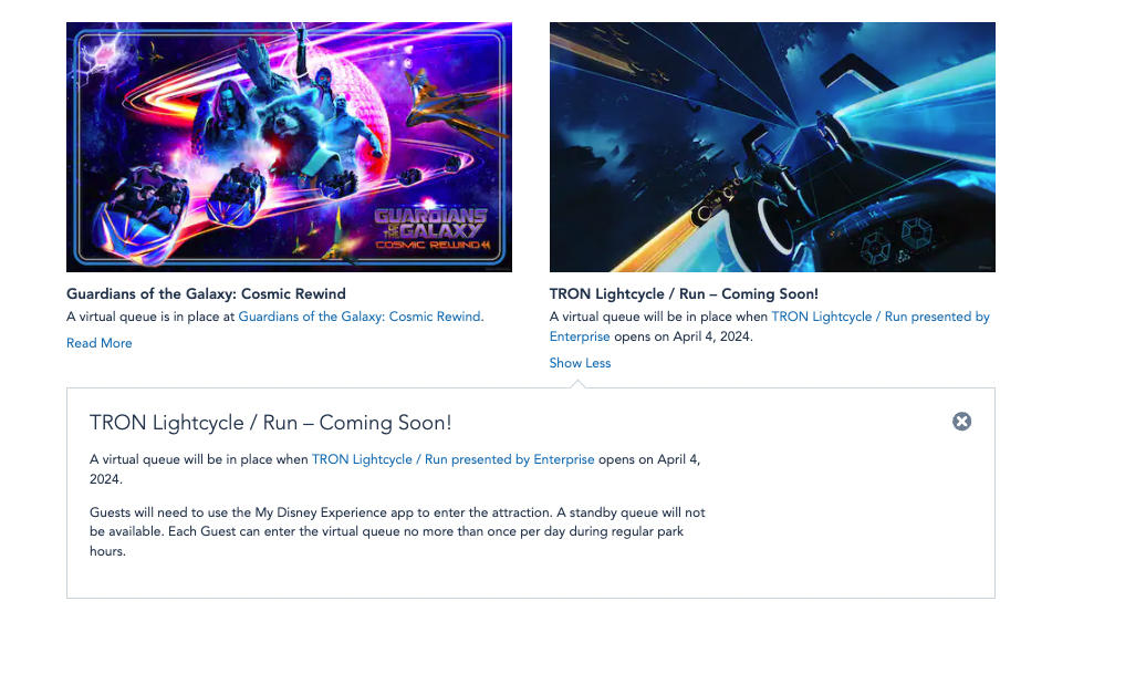 We officially saw today on Disney’s website that TRON Lightcycle / Run will be offered as an Individual Lightning Lane selection in addition to a virtual queue. Individual Lightning Lane, or ILL, is a pay-per-ride service for in-demand attractions that allow guest to skip the line on popular attraction for an upcharge.