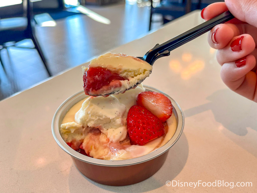 The jam on the bottom had both strawberries and raspberries, which added a nice tartness to the dessert — but here’s where it got a little odd. In the jam, there were pretty large chucks of fruit that threw us off. Like, too-big-for-our-spoon big, and too tough to cut. We almost would have preferred to just have the fruit topping and a crust on the bottom.