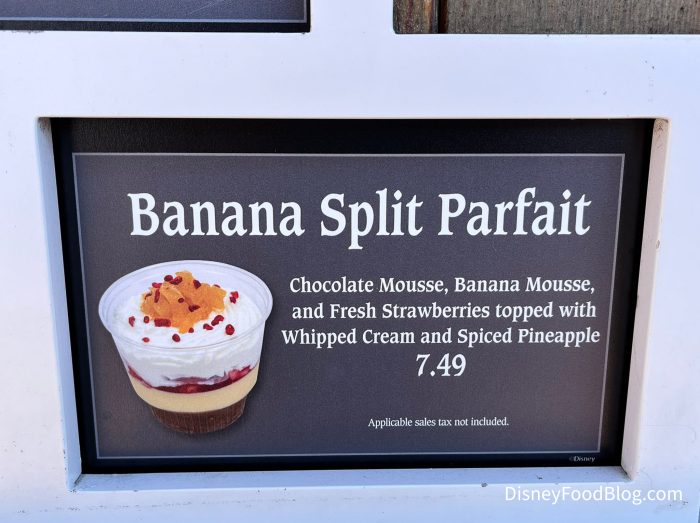 You can find this yummy dessert at Dockside Diner in Disney’s Hollywood Studios. This is the Banana Split Parfait, made with chocolate mousse, banana mousse, and fresh strawberries topped with whipped cream and spiced pineapple.