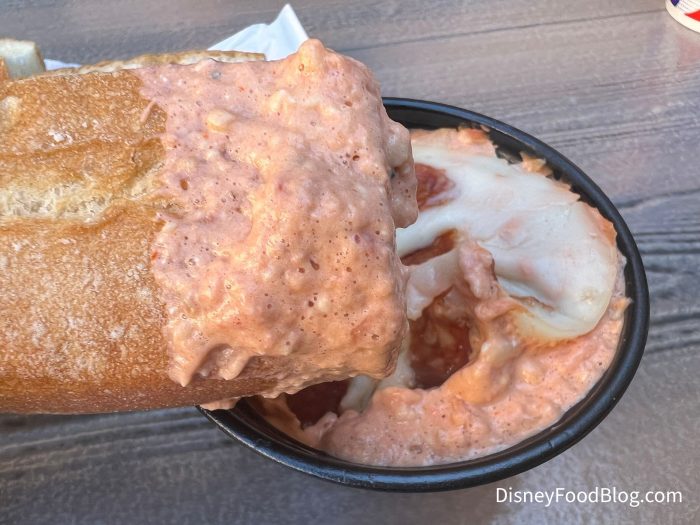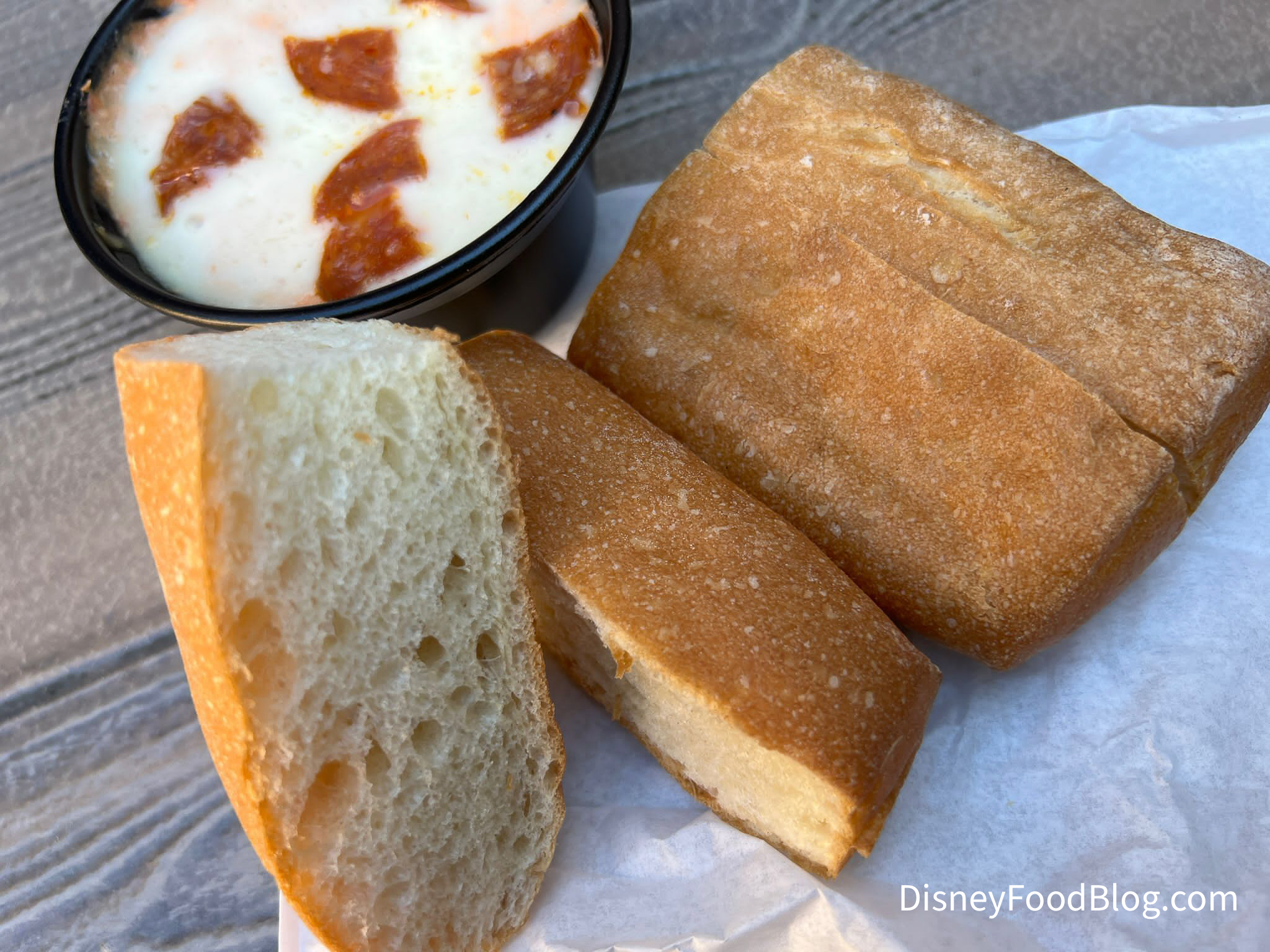 If you’re at Disneyland, you can find the Pepperoni Pizza Dip at the snack cart just to the left of Sleeping Beauty Castle for $5.49. Basically, it’s all you could dream of for a pizza — but condensed into a dipping sauce and served with freshly toasted bread! It’s made with a blend of cheeses, marinara sauce, and pepperoni.