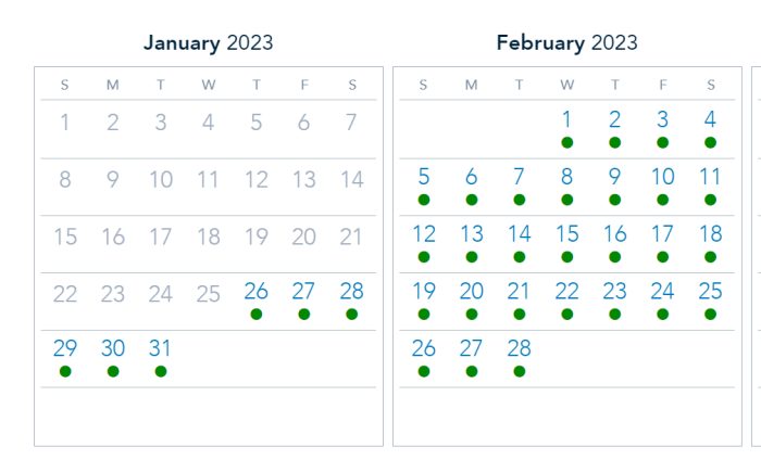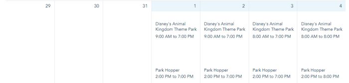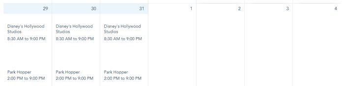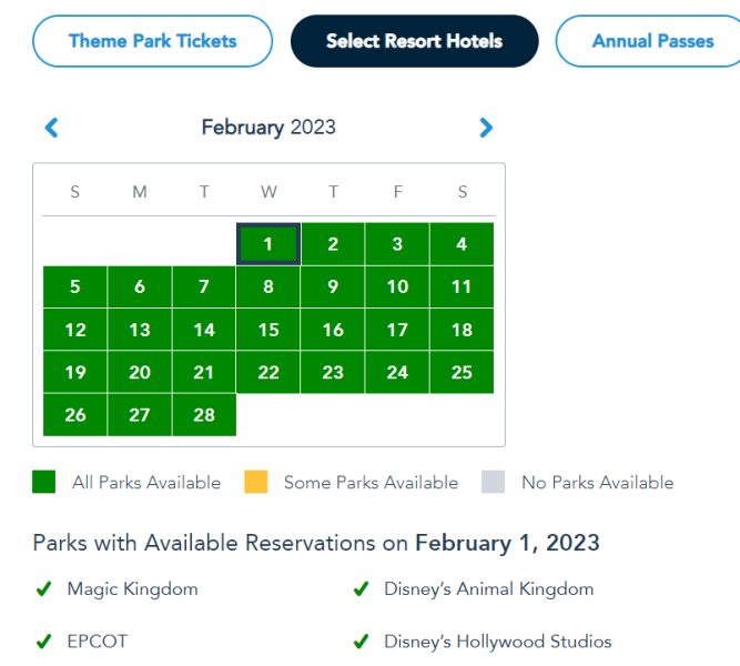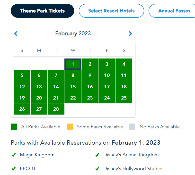 February 1st-4th is also all in the green (meaning all four parks are available).