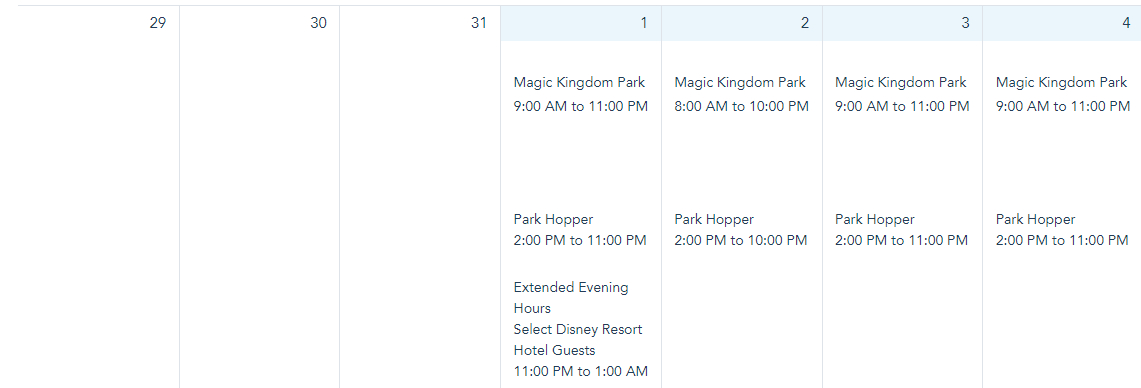 Magic Kingdom will be open from 9AM-11PM on January 29th and 30th and from 8AM to 4:30PM on January 31st.