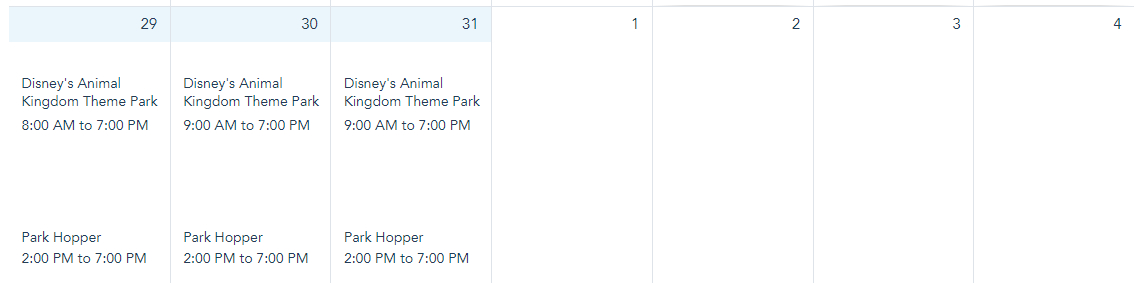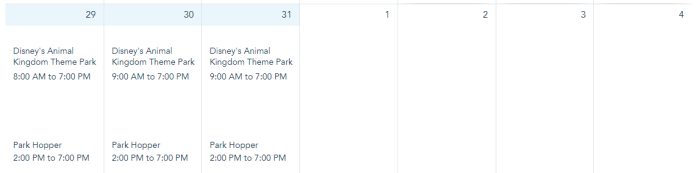 Park hours for Animal Kingdom are from 8AM-7PM on January 29th and 9AM-7PM on January 30th-31st.