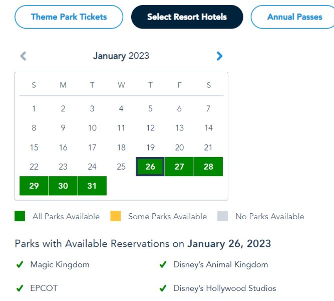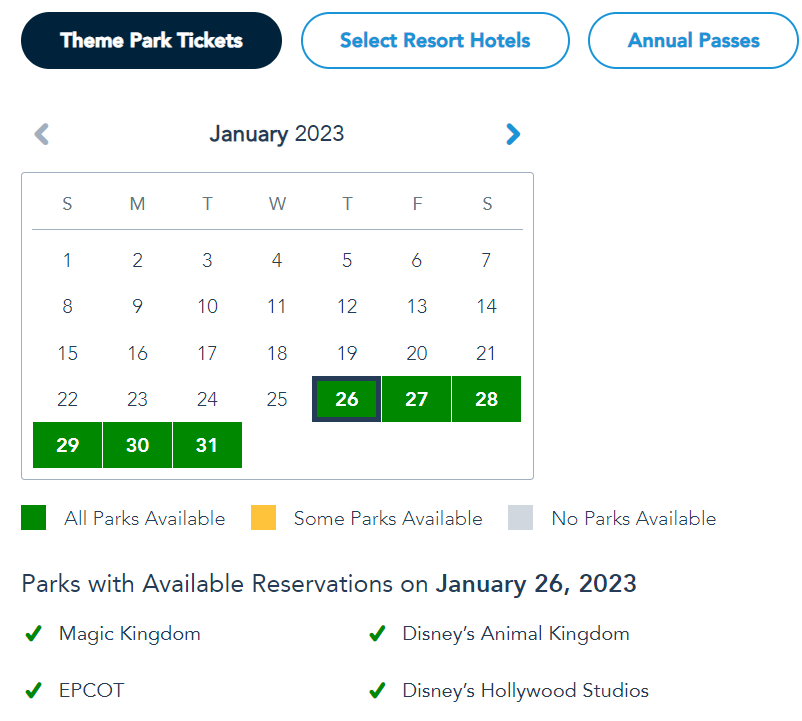 Park pass reservation availability depends on if you have theme park tickets, are a Disney World hotel guest, or are Annual Passholders. For visitors with Theme Park Tickets, all four parks are available from January 29th-31st.