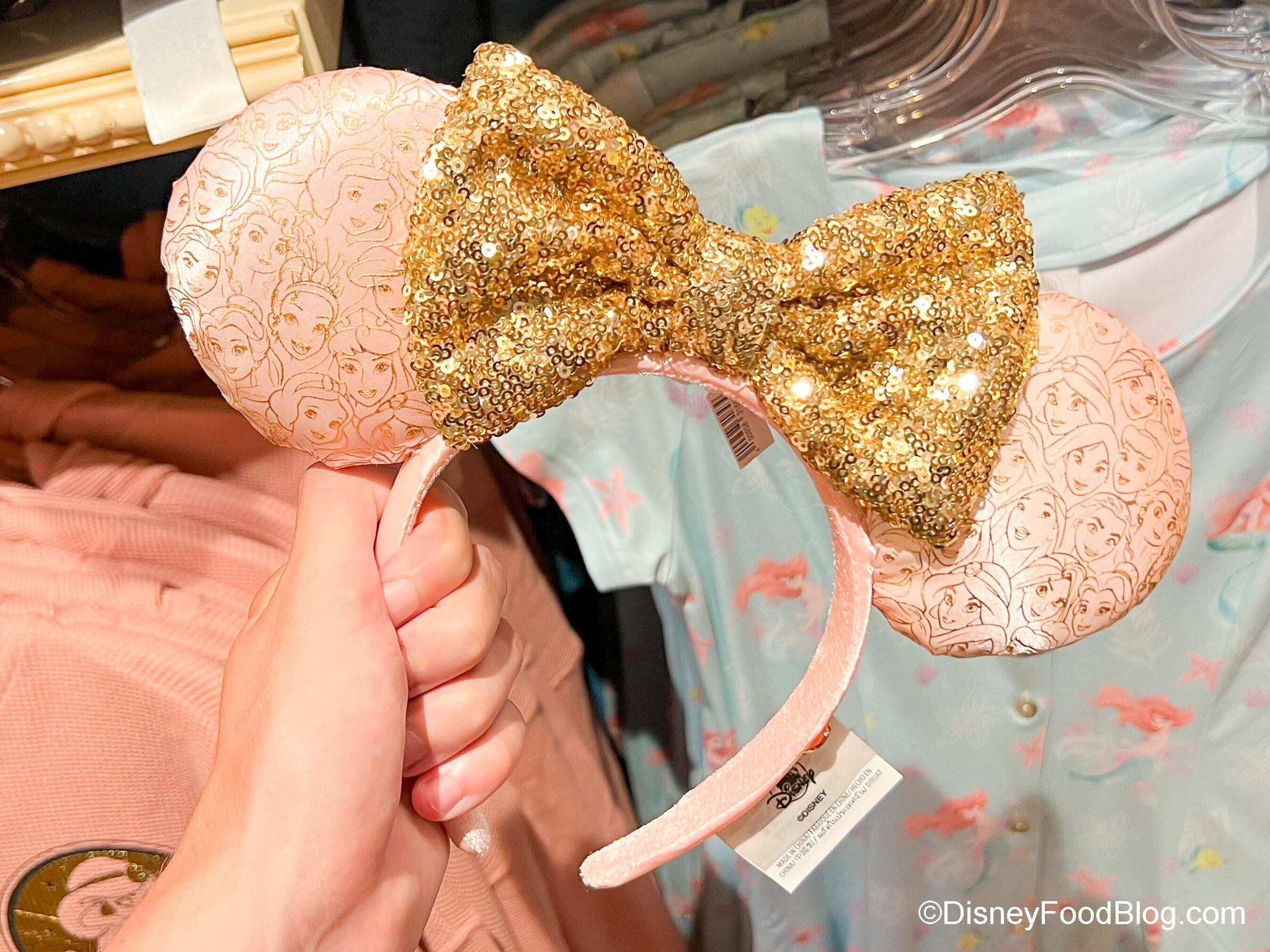 These pretty-in-pink Disney Princess Ears feature gold outlines of the Princesses’ faces — perfect to match the gold sequined bow.