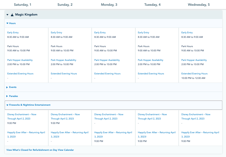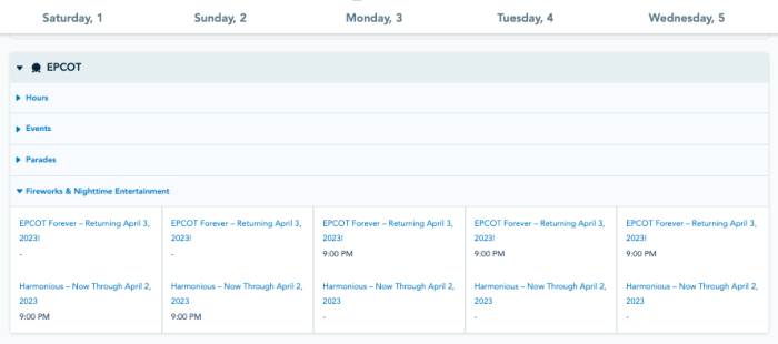 And over in EPCOT, EPCOT Forever will also return on April 3rd at — you guessed it — 9PM! Showtimes can be subject to change in Disney World, but this is what’s on the schedule as far out as we can see.