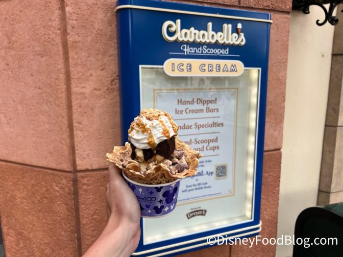 This time, we’re celebrating the 100th Anniversary of the Walt Disney Company with new nighttime shows, all kinds of collectibles, and PLENTY of food! We shared FULL look at all of the 100th Anniversary treats in Disneyland here, but right now it’s time to head to Clarabelle’s Hand-Scooped Ice Cream for a sweet treat!