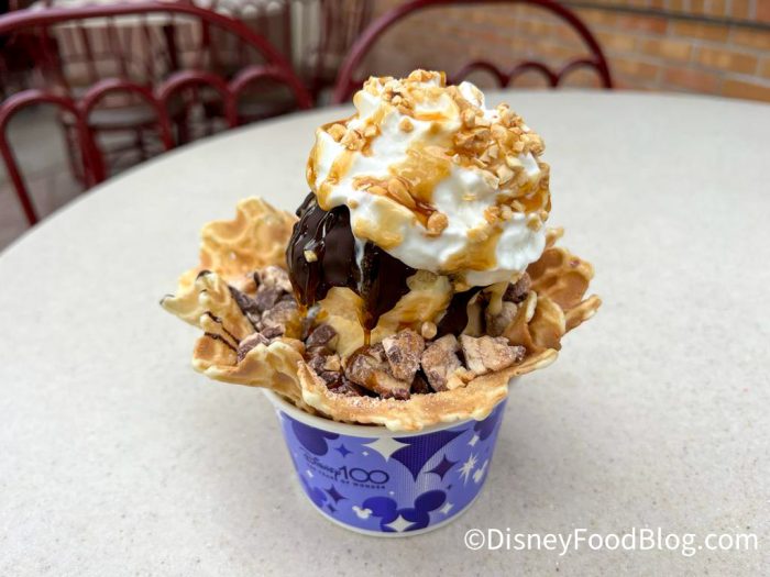 You’ll find Clarabelle’s Hand-Scooped Ice Cream over at Disney California Adventure. It’s a great spot to grab some ice cream on a regular Disney day, but during the 100th Anniversary, Clarabelle’s is serving up a Snickers Sundae!