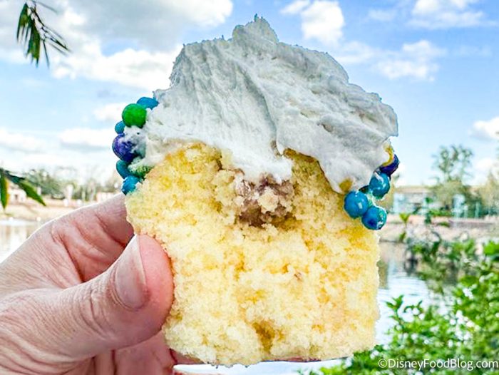 The vanilla marshmallow icing is different from the typical buttercream on most Disney cupcakes, but was delicious! If you love marshmallows or just super sugary treats, you’ll love this icing. It’s very light and fluffy, and the crispy pearls added a nice crunchy texture.