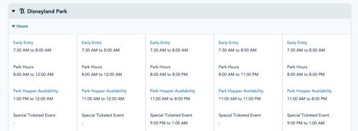 Disney’s Park Hopper website also advises guests to check the Disneyland app or Park Hours Calendar for the most up-to-date Park Hopper hours because those can “change depending on the day and park.”