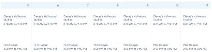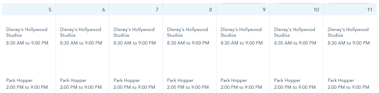 At Hollywood Studios, park hours are from 8:30AM-9PM on February 5th-11th.