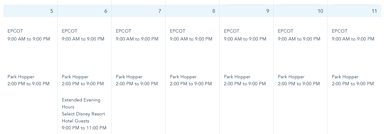 The park hours for EPCOT are from 9AM-9PM on February 5th-11th.