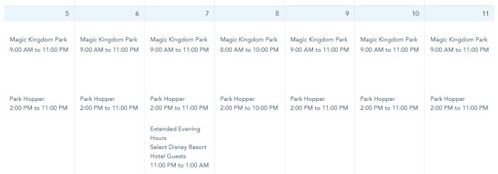 On February 5th-7th and 9-11th Magic Kingdom will be open from 9-11PM. On February 8th, the park will be open from 8AM-10PM.