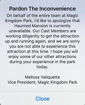At around 2PM today, we received a pop-up message in the app from the Vice President of Magic Kingdom Park, Melissa Valiquette, that Haunted Mansion is temporarily closed.
