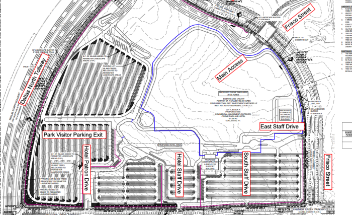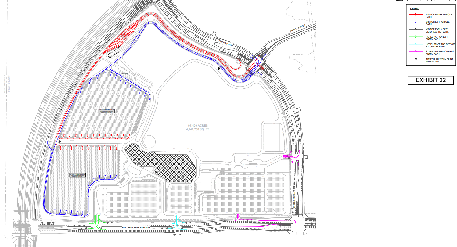 The plans also include a map showing the proposed site. The park will be located on the “east side of Dallas North Tollway between Panther Creek Parkway and Fields Parkway in Frisco, Texas.”