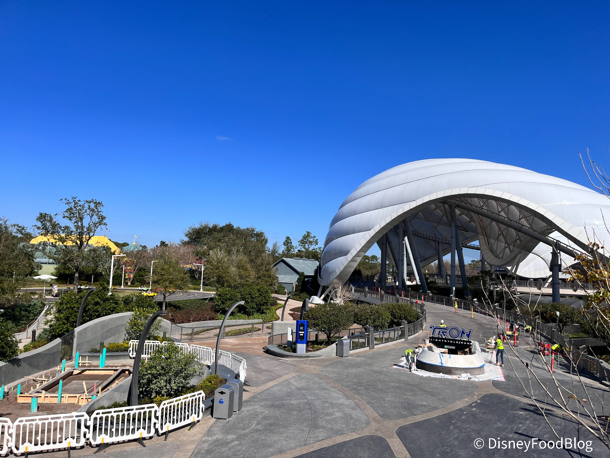 We are counting down the days until the opening of this new ride! Here’s a view from the PeopleMover of the current state of the ride. That little blue sign points visitors over to the pathway that leads to Storybook Circus, so you’ll be able to access TRON from 2 different pathways.